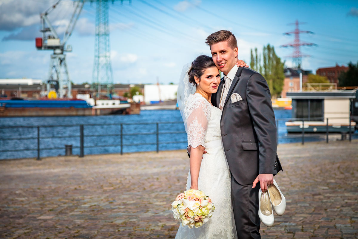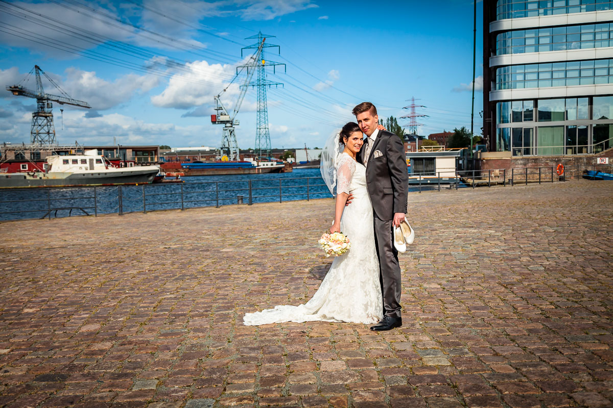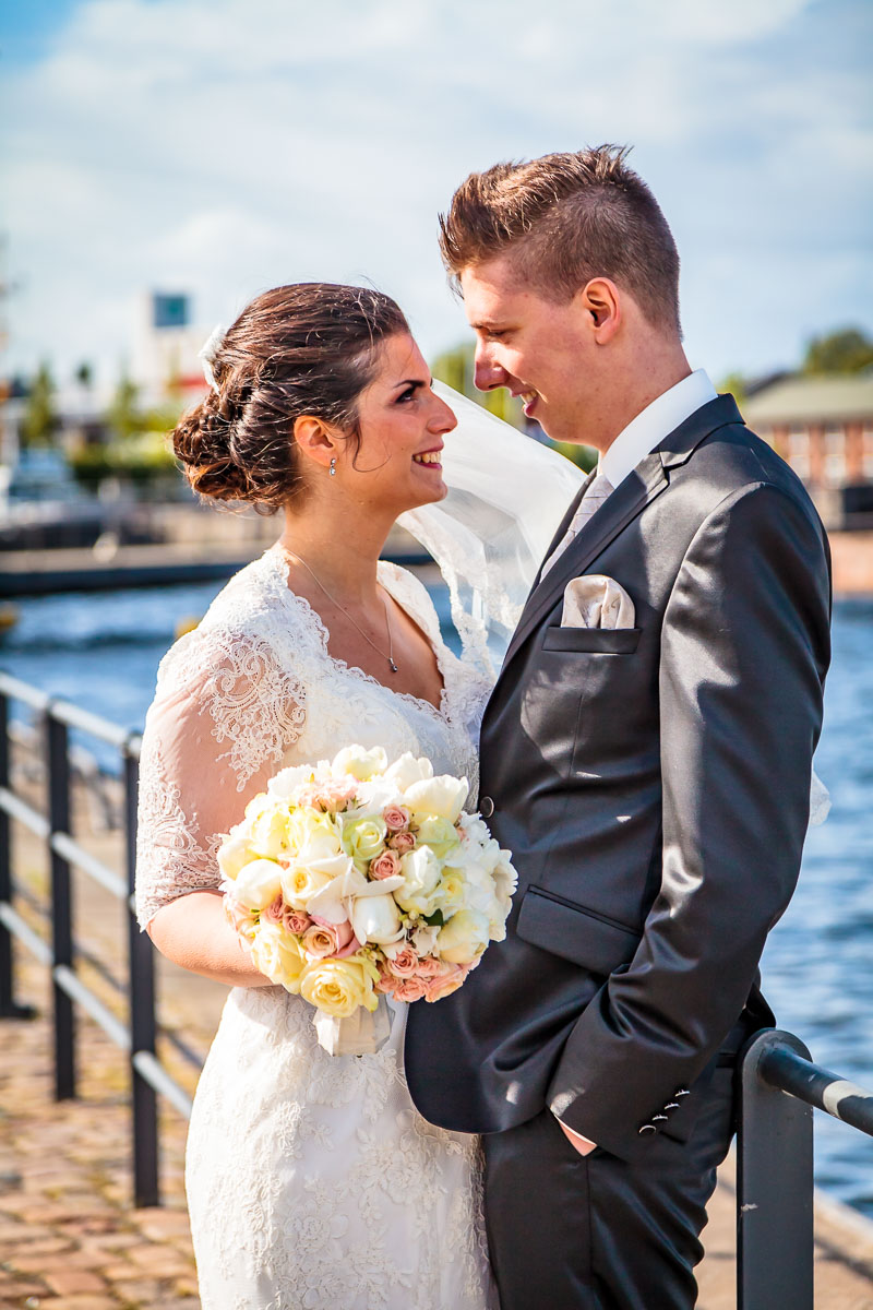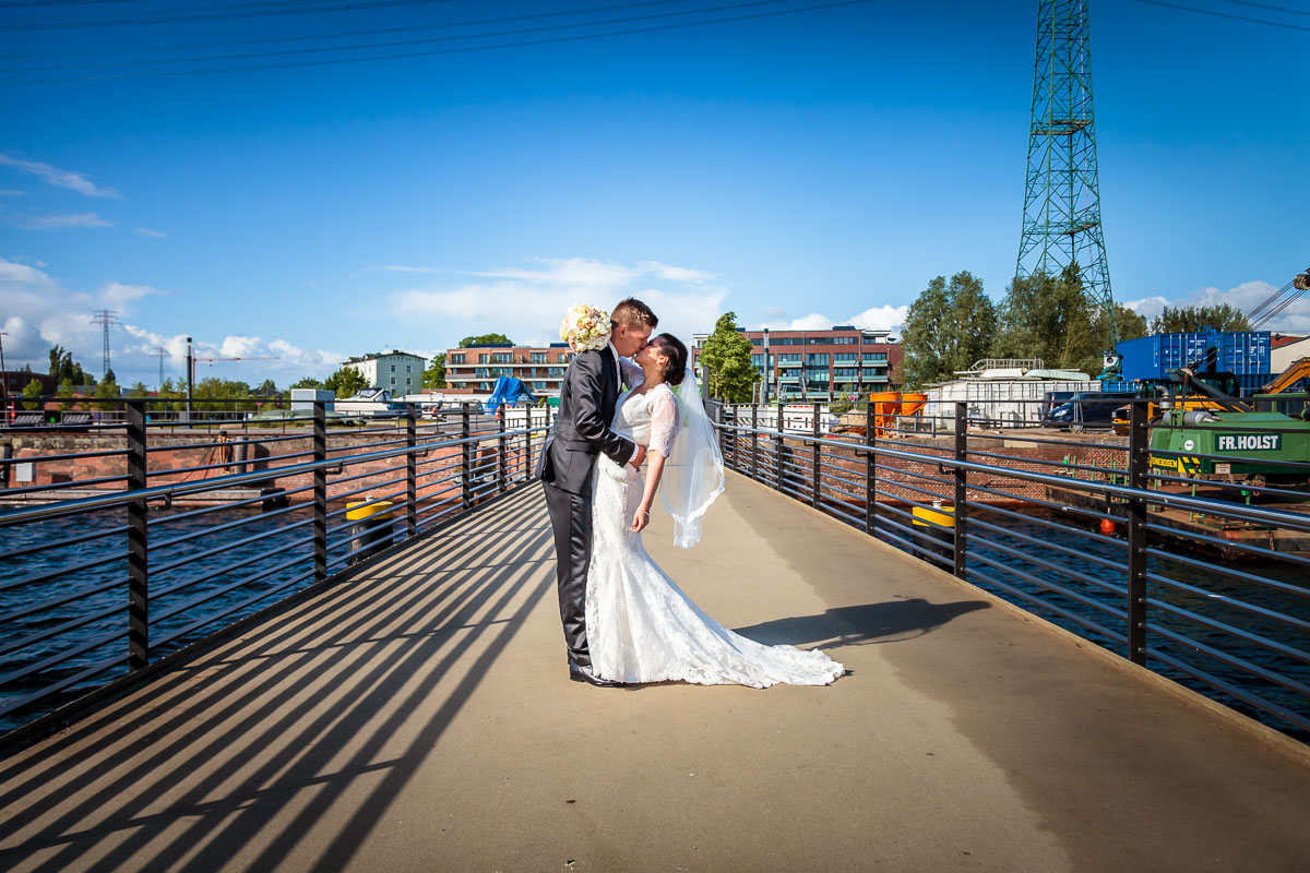 Bevor wir in die Location selbst gegangen sind, hatten wir noch ein paar Minuten Zeit um vor der Hafenkulisse in Harburg ein kleines Fotoshooting durchzuführen, dann ging es auch schon ab zum Empfang. Vor dem kleinen Fleet machten wir vor dem Abendessen noch die Gruppenfotos und die Gäste hatten Zeit für Fotos mit dem Brautpaar. Dann ging es auch schon mit dem Programm weiter…
