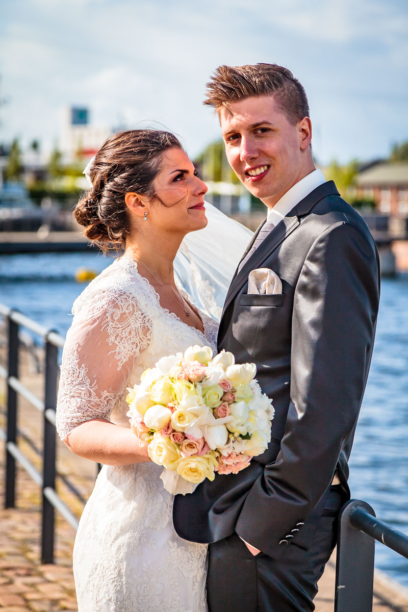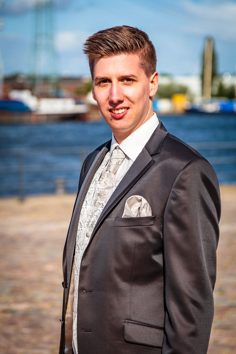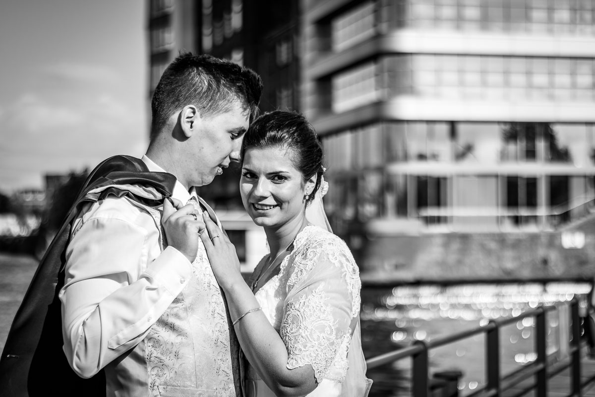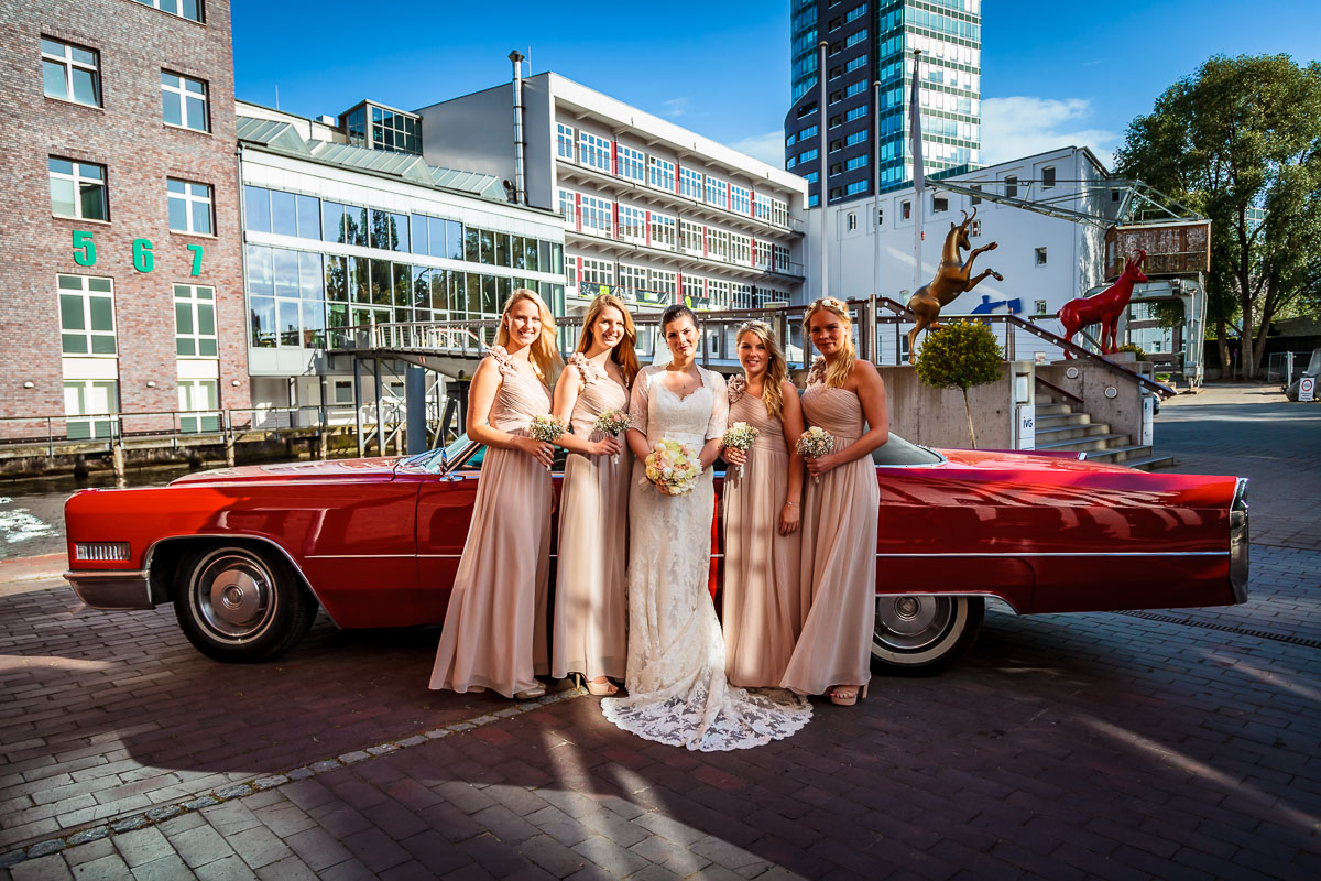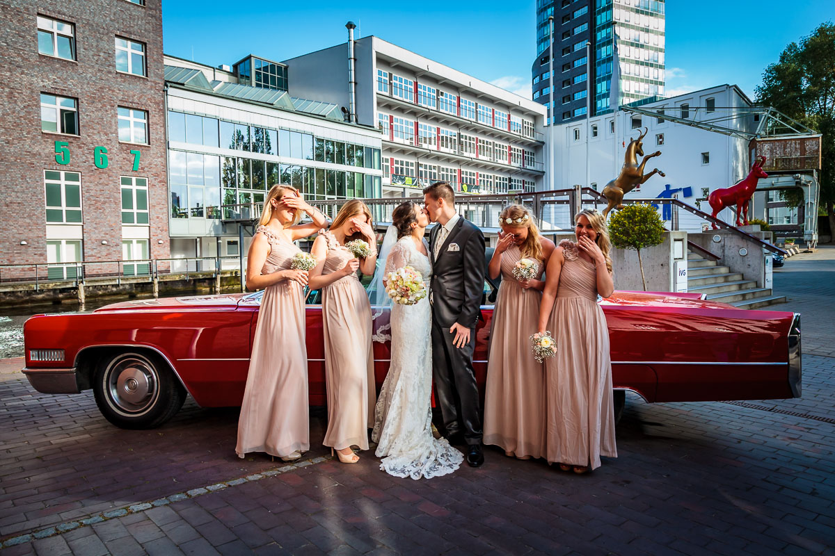 Bevor wir in die Location selbst gegangen sind, hatten wir noch ein paar Minuten Zeit um vor der Hafenkulisse in Harburg ein kleines Fotoshooting durchzuführen, dann ging es auch schon ab zum Empfang. Vor dem kleinen Fleet machten wir vor dem Abendessen noch die Gruppenfotos und die Gäste hatten Zeit für Fotos mit dem Brautpaar. Dann ging es auch schon mit dem Programm weiter…