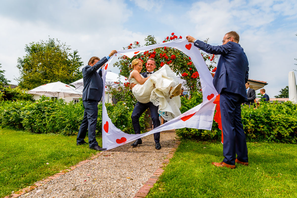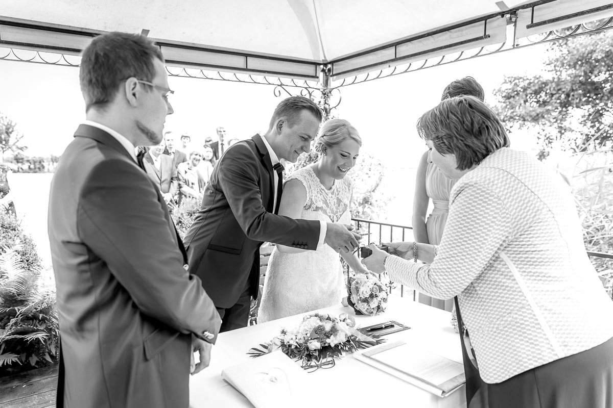 Jetzt möchtet ihr bestimmt noch wissen, wie der Bräutigam heißt. Eigentlich heißt Benjamin Marco. Bis zur Trauung war das auch noch so. Während der Trauung nannte die Standesbeamtin jedoch Marco ein mal Benjamin und schon war es geschehen. Marco wurde am Tag der Hochzeit immer wieder mit dem Namen Benjamin angesprochen – es war an diesem Tag einfach der Running Gag.