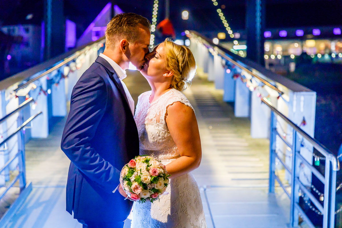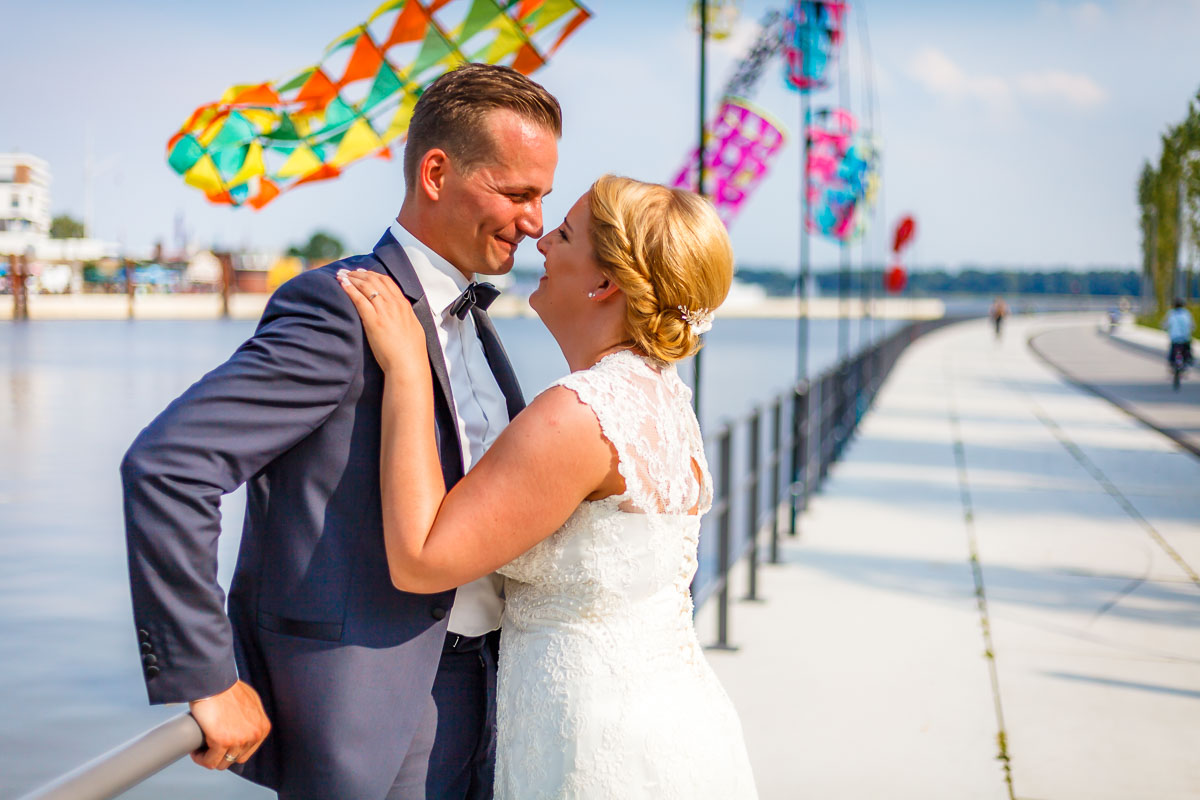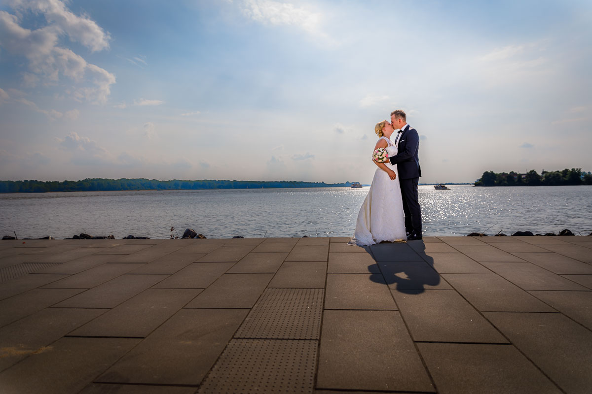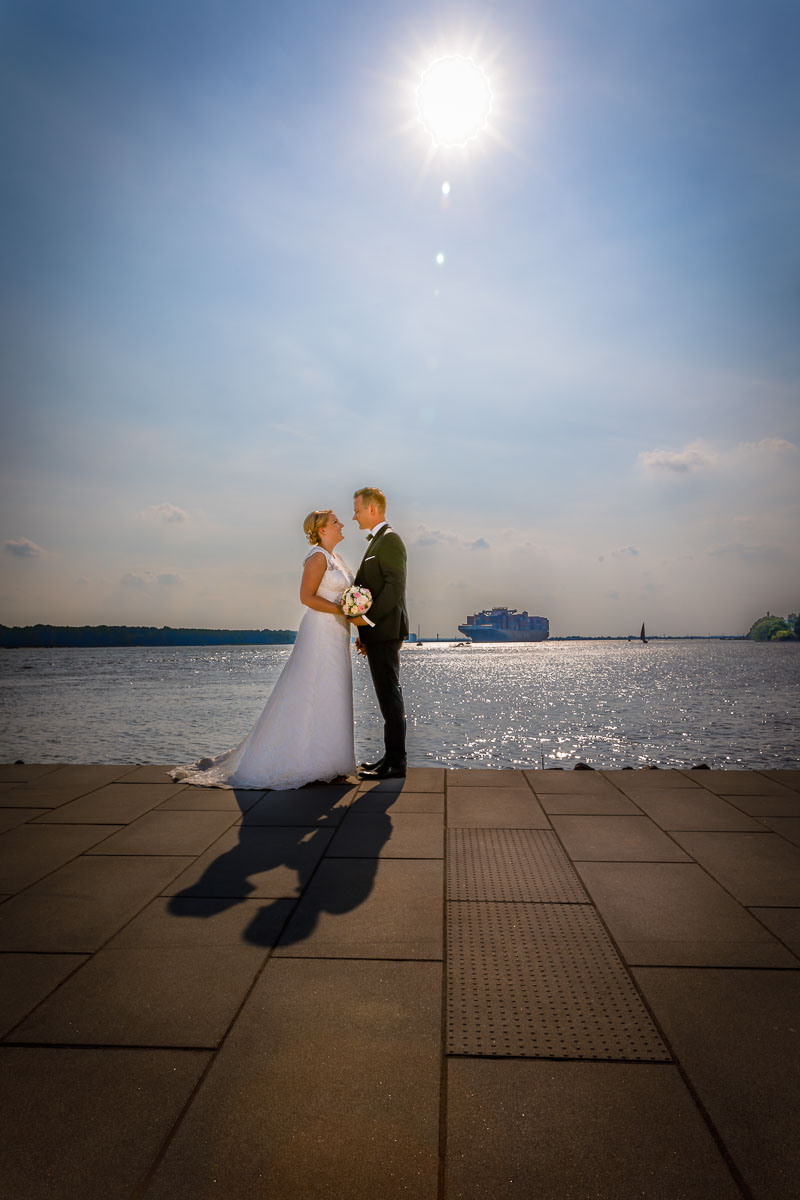 Im Schulauer Fährhaus angekommen gab es auch hier einen kurzen Empfang. Im Anschluss machten wir uns direkt auf den Weg um ein paar Fotos zu machen. Dadurch, dass in Wedel Hafenfest war, waren direkt vorm Schulauer Fährhaus mehrere Buden und Karussells aufgebaut. Wir drehten eine kurze Runde über das Hafenfest (und machten natürlich Fotos ;-)) und gingen dann weiter den Strandweg entlang bis auf die andere Seite des kleinen Hafenbeckens. Hier war es etwas ruhiger und wir konnten etwas abseits vom Trubel des Hafenfestes die Fotos machen. Antje und Benjamin wollten gerne ein Foto mit einem großen Pott im Hintergrund haben. Ich denke, das haben wir geschafft. 🙂