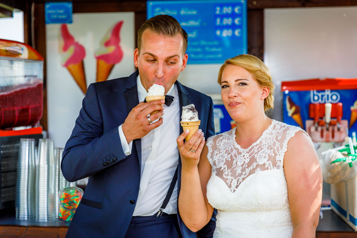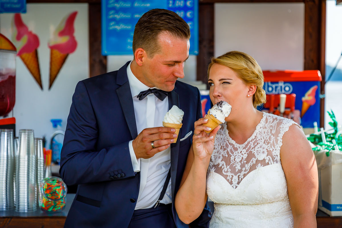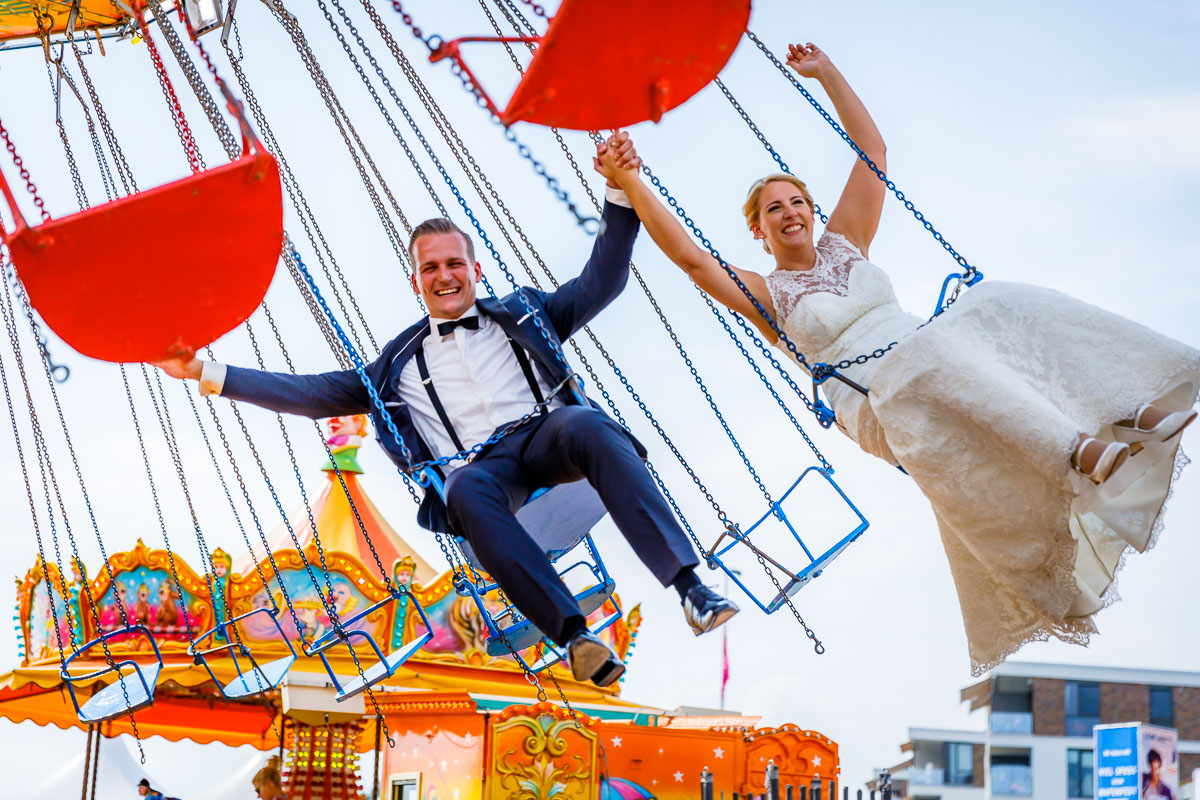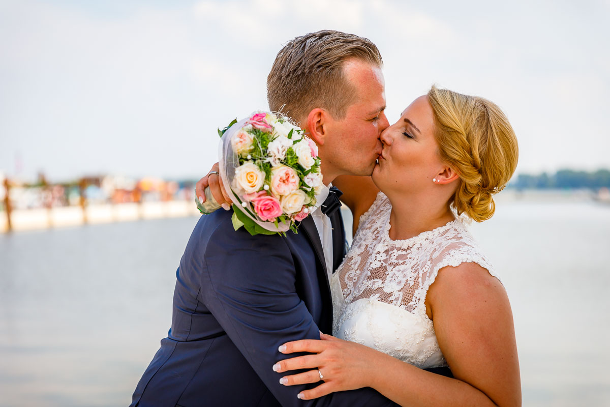 Im Schulauer Fährhaus angekommen gab es auch hier einen kurzen Empfang. Im Anschluss machten wir uns direkt auf den Weg um ein paar Fotos zu machen. Dadurch, dass in Wedel Hafenfest war, waren direkt vorm Schulauer Fährhaus mehrere Buden und Karussells aufgebaut. Wir drehten eine kurze Runde über das Hafenfest (und machten natürlich Fotos ;-)) und gingen dann weiter den Strandweg entlang bis auf die andere Seite des kleinen Hafenbeckens. Hier war es etwas ruhiger und wir konnten etwas abseits vom Trubel des Hafenfestes die Fotos machen. Antje und Benjamin wollten gerne ein Foto mit einem großen Pott im Hintergrund haben. Ich denke, das haben wir geschafft. 🙂